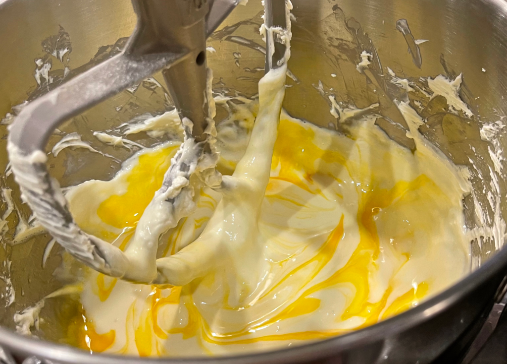 Whisk the sugar and flour together and add to the cream cheese on low, mixing well. Add the eggs one at a time, blending in on low speed.