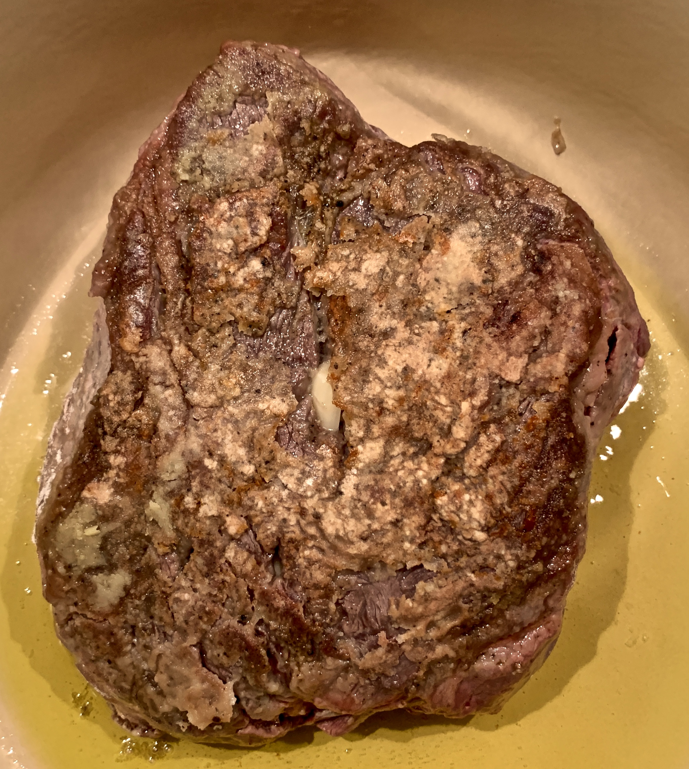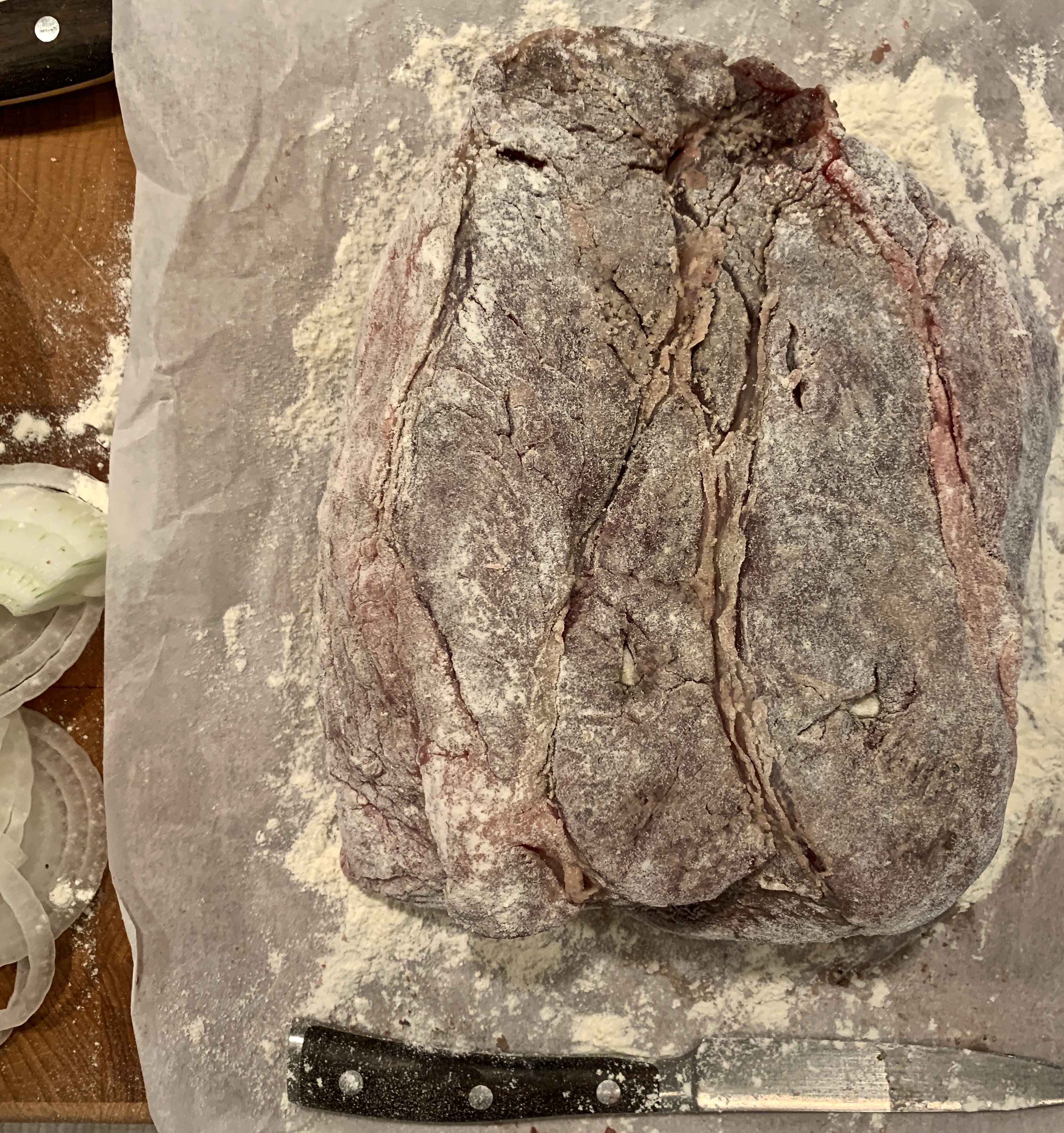 - Dust both sides and the edges of the roast with ¼ cup of the flour, dusting off any excess.