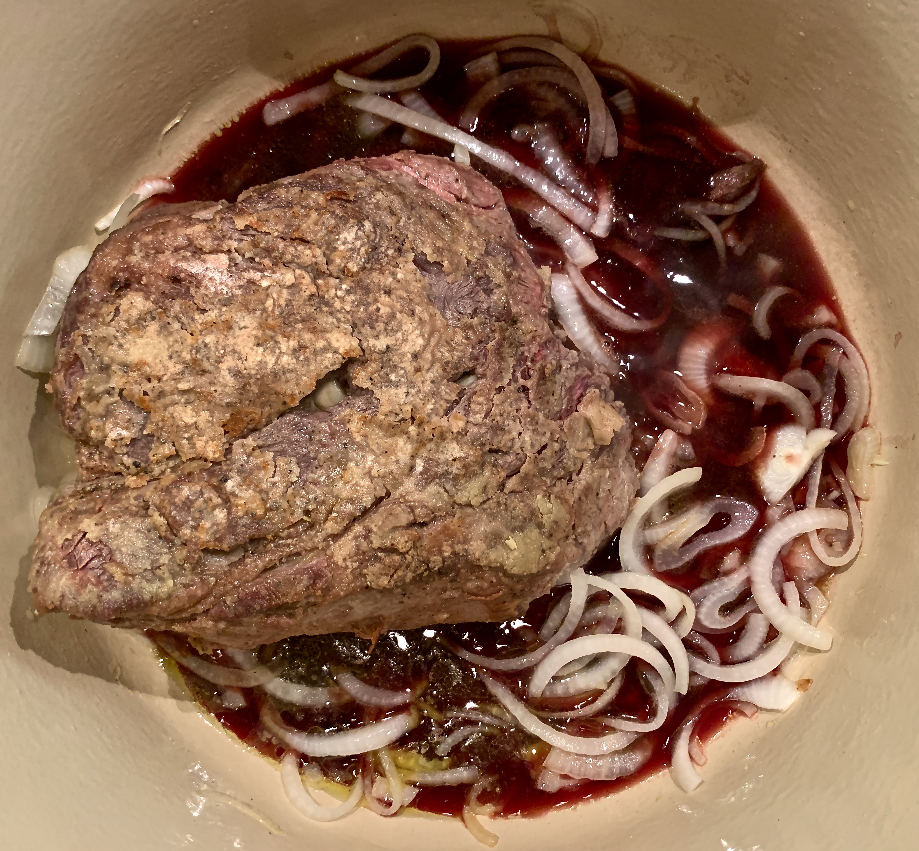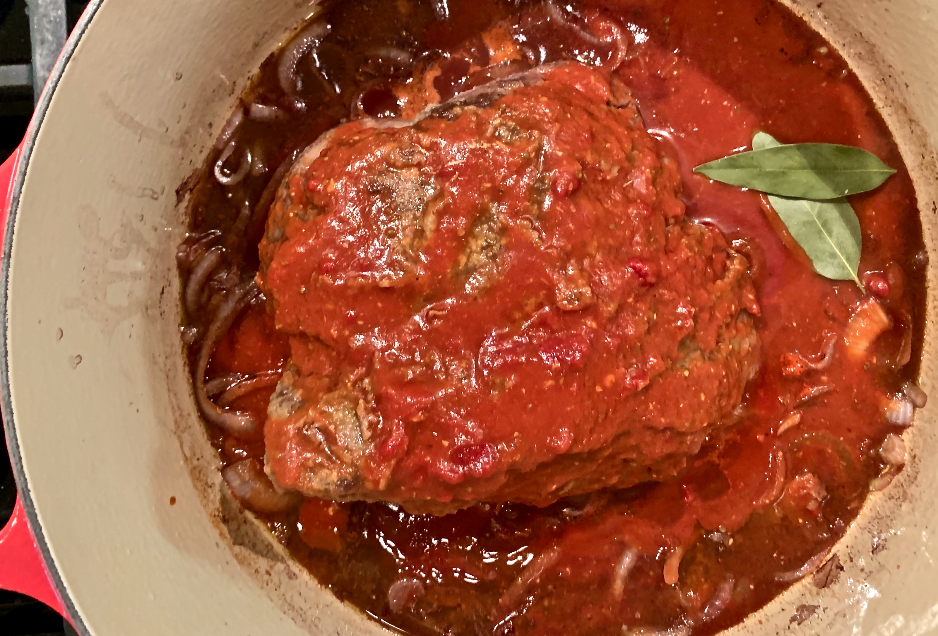 Pour the tomato sauce over the roast and toss in the bay leaves. Cover the pan, reduce the heat to low and cook for 2 hours. Stir occasionally to make sure the roast and onions aren’t sticking to the bottom of the pan.