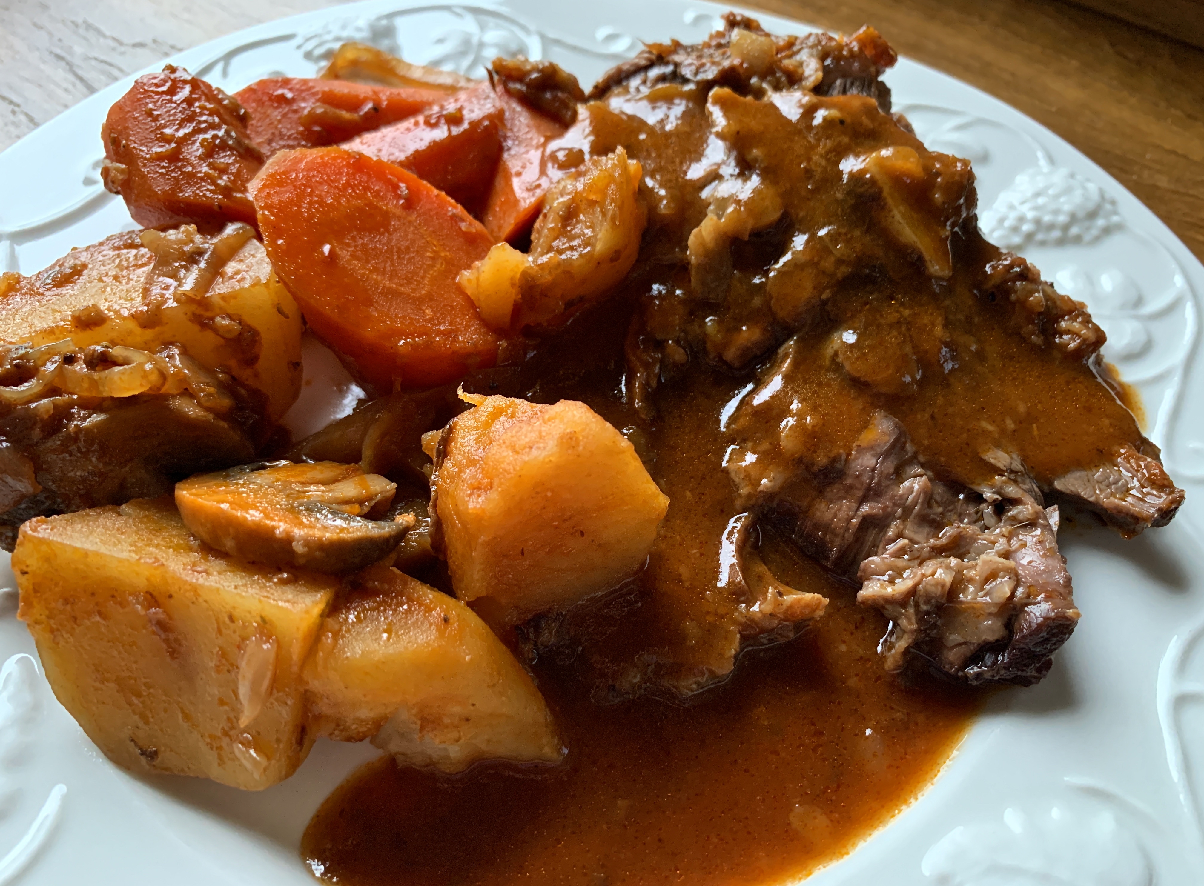 - After 2 hours, add the carrots, potatoes, and mushrooms and continue cooking over low heat for another 1 to 1-½ hours or until the meat is fork tender and the vegetables are cooked through.