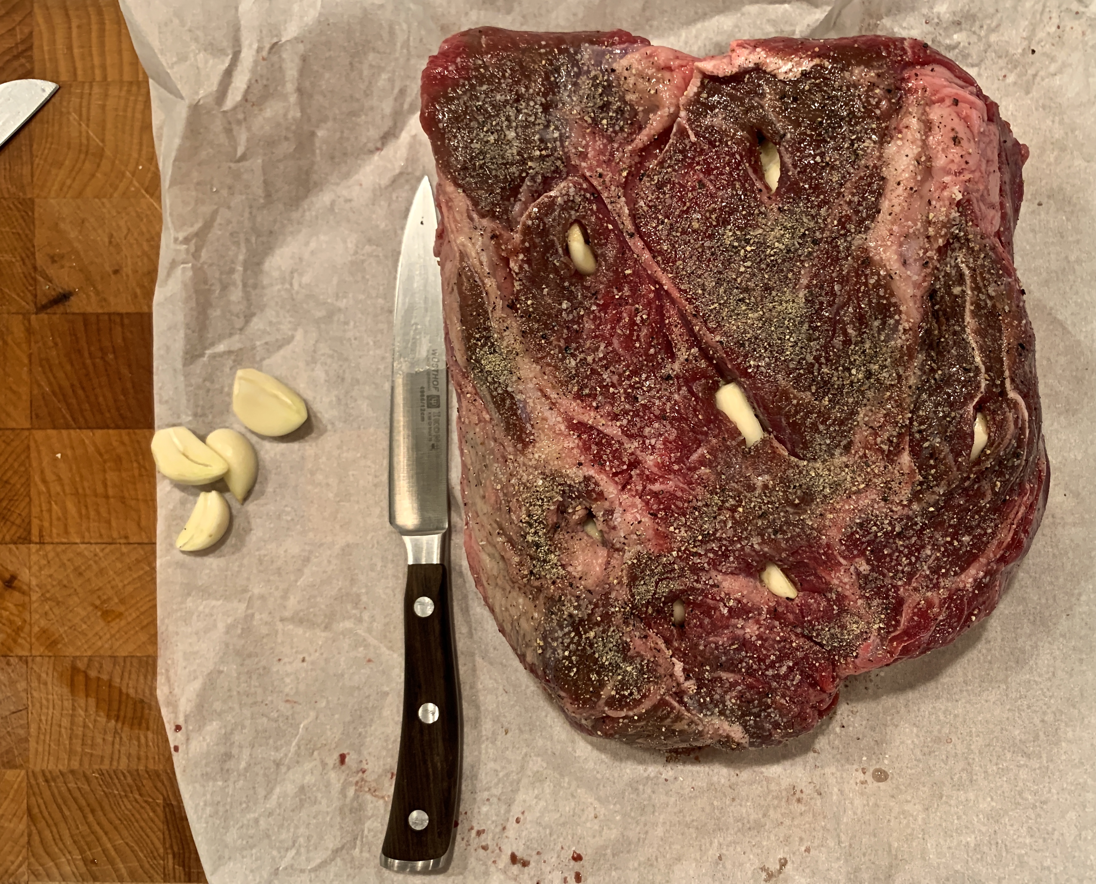 - Let the meat rest at room temperature for about 30 minutes. Using a sharp knife cut “pockets” into the meat then tuck a piece of garlic into each one.