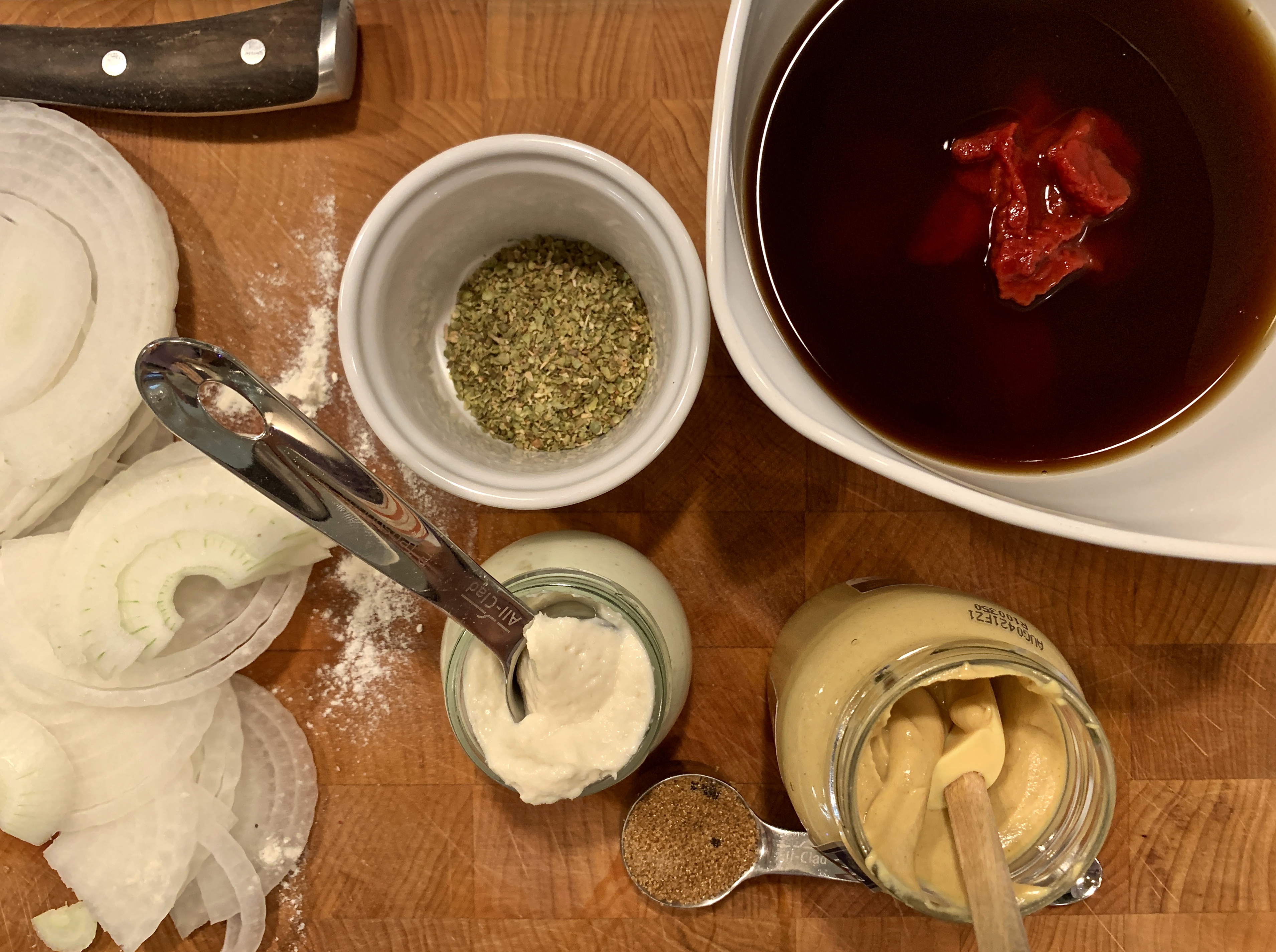 - In a small bowl whisk together the tomato sauce, the brown sugar, oregano, horseradish, and mustard.