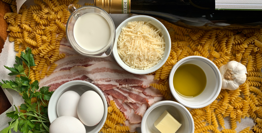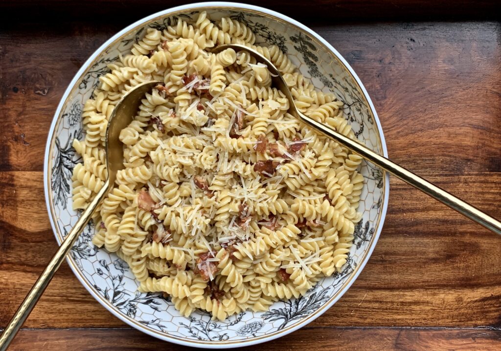 My Mother and Grandmothers taught me well, keep your kitchen stocked with staples. And at our house, you will always find pasta in the pantry and bacon, eggs and Parmesan cheese in the fridge. There is an elegant simplicity to this dish. The sauce starts with eggs and Parmesan cheese plus cream to add a luscious layer.