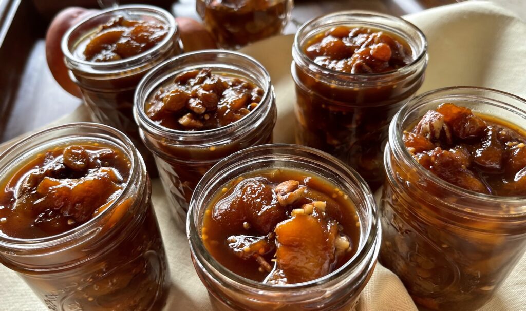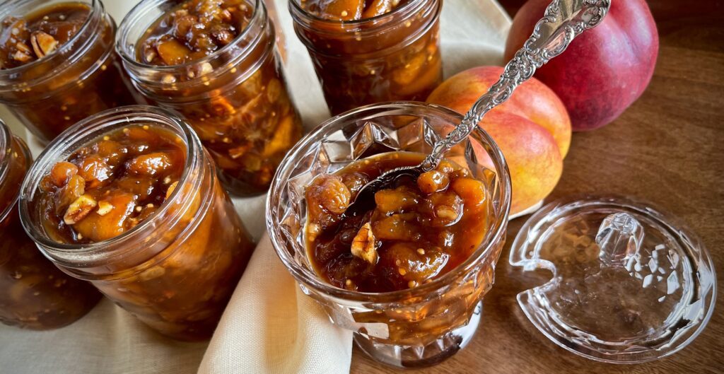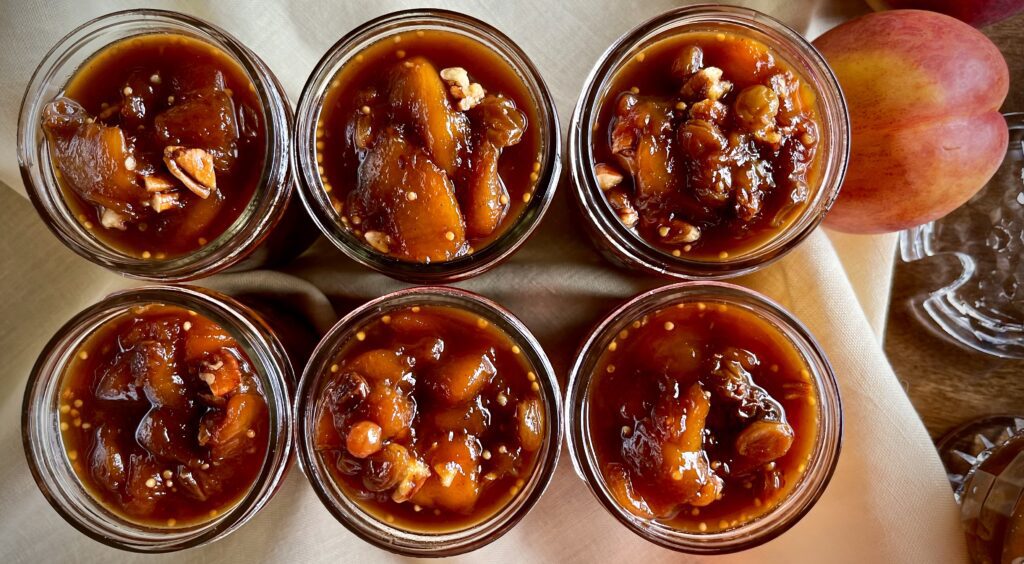 At least twice a year we’re in the kitchen canning – summer and again during the holidays. Summer canning is the perfect time to capture those gorgeous flavors to savor in the fall. Chutneys are often overlooked but should be added to your list. This chutney brings together two luscious stone fruits, plump golden raisins all cooked with a medley of spices, sweetened with dark brown sugar, and brightened with a tang of apple cider vinegar. Then toasted pecans are added at the end for a delicious crunch.