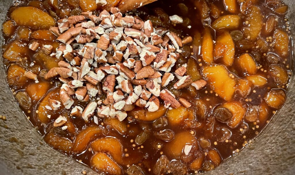 Remove the pan from the heat and stir in the toasted pecans, mixing evenly into the chutney.