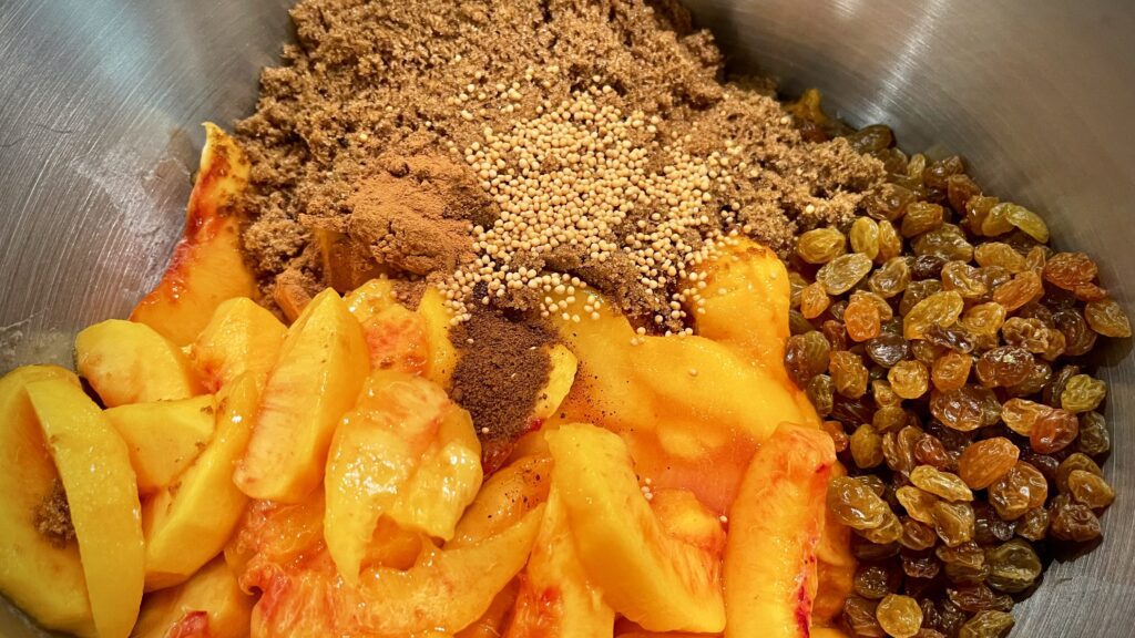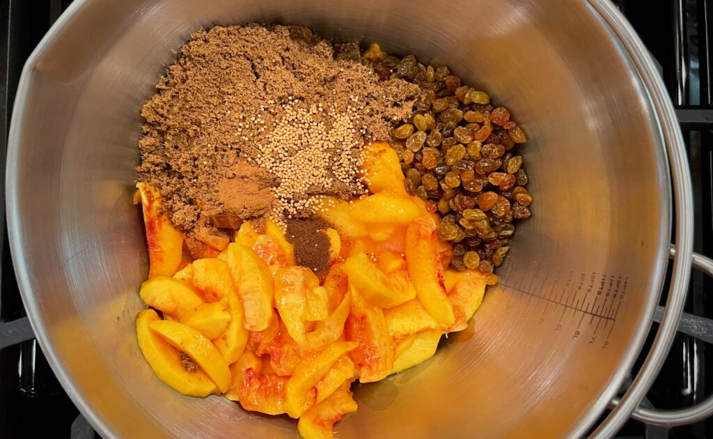 Toss the peaches and nectarines together in a large kettle or stockpot. If you’re using frozen fruit, add any of the juice accumulated when the fruit thaws. Add the brown sugar, raisins, mustard seed, cinnamon, nutmeg, cloves, and vinegar.