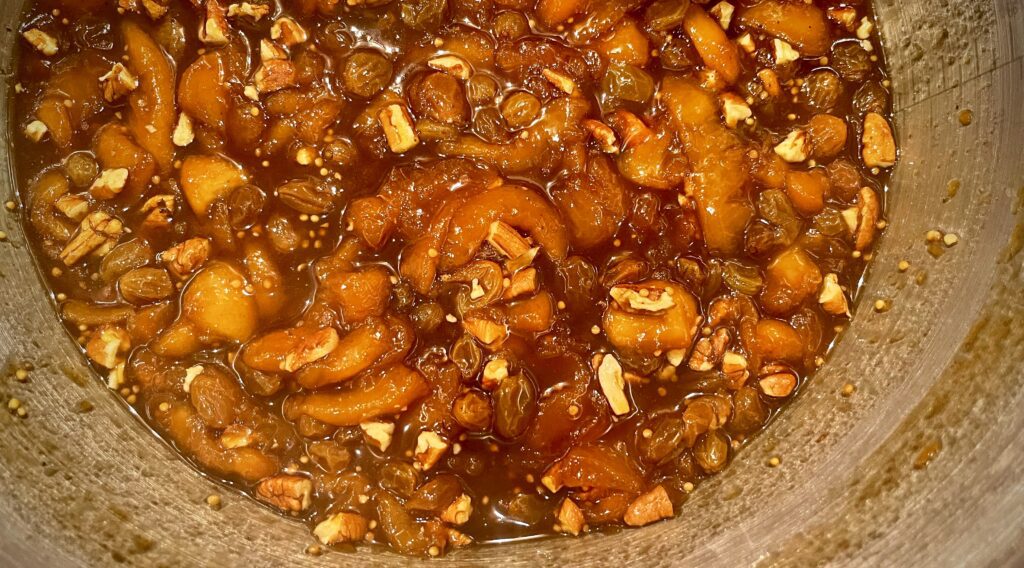 - Remove the pan from the heat and stir in the toasted pecans, mixing evenly into the chutney.