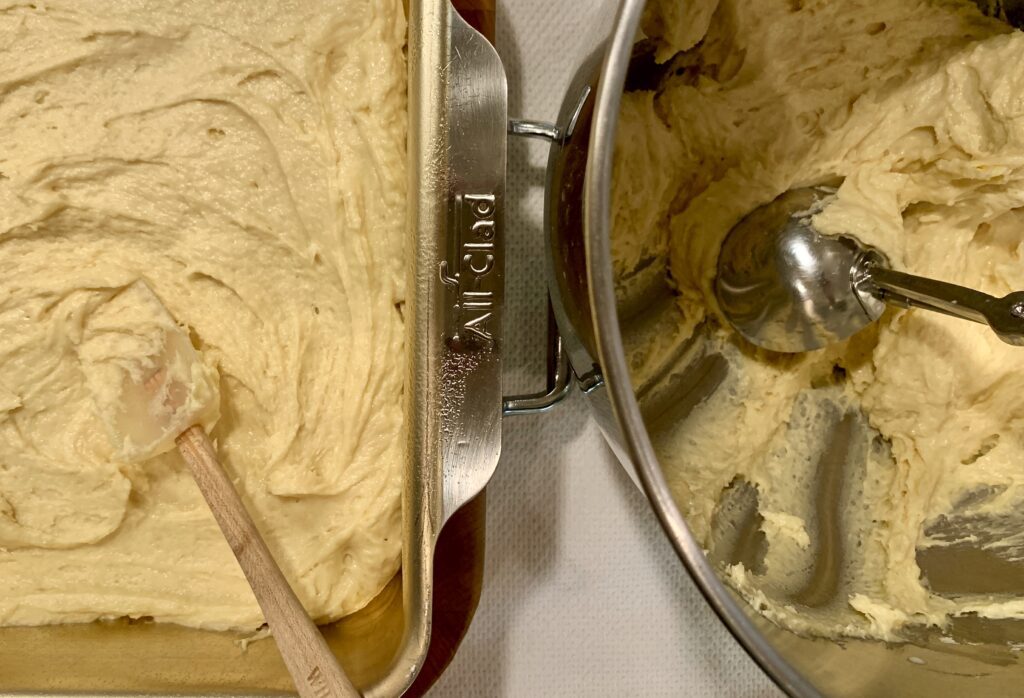 Scoop about half of the cake batter into the bottom of the prepared baking pan spreading the batter out as smoothly as possible.