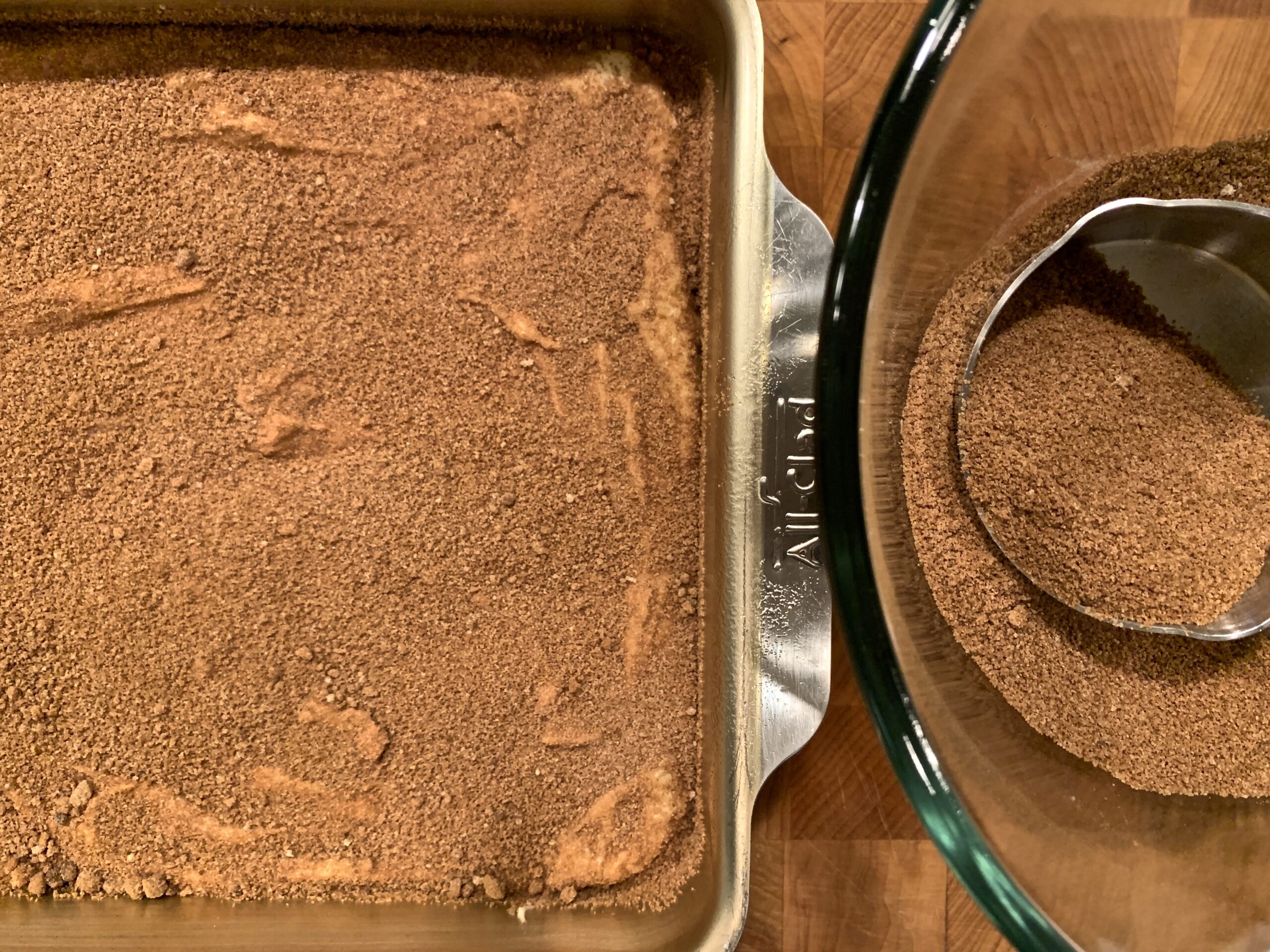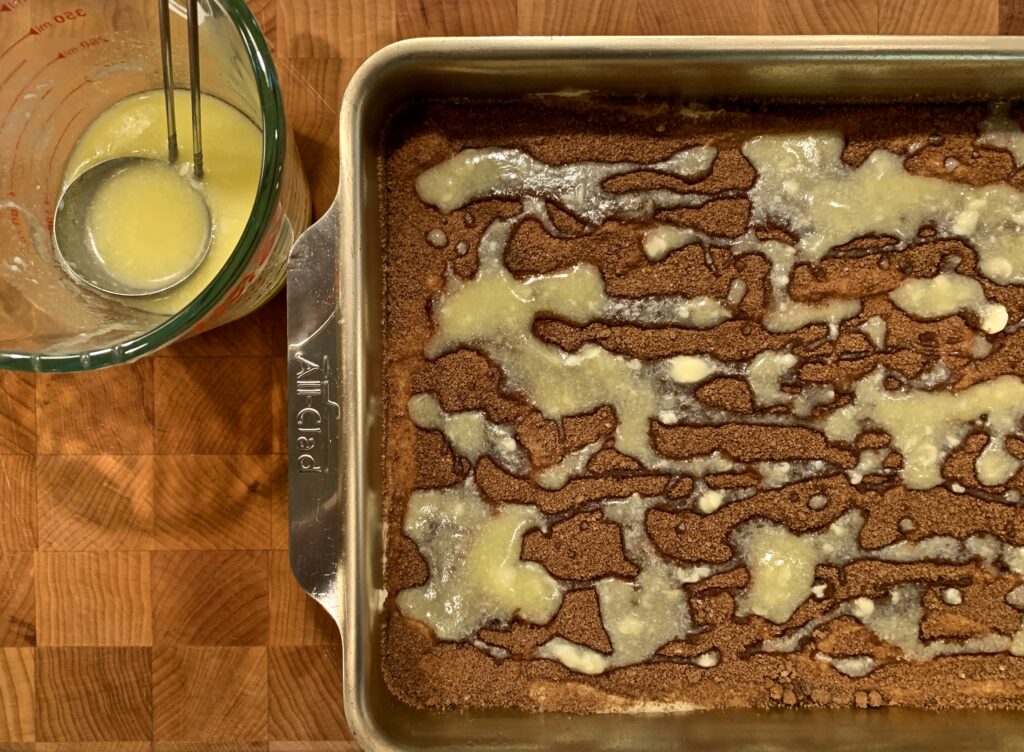 Top with half of the cinnamon and brown sugar mixture, gently shaking the pan to spread it evenly across the cake batter. Drizzle half of the melted butter over the cinnamon and sugar topping.