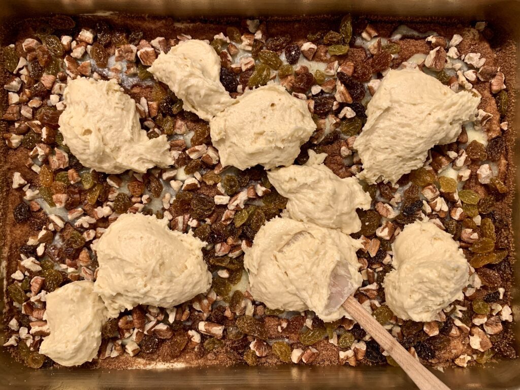 - Drizzle half of the melted butter over the cinnamon and sugar topping. Sprinkle about half of the raisins and pecans over the top.