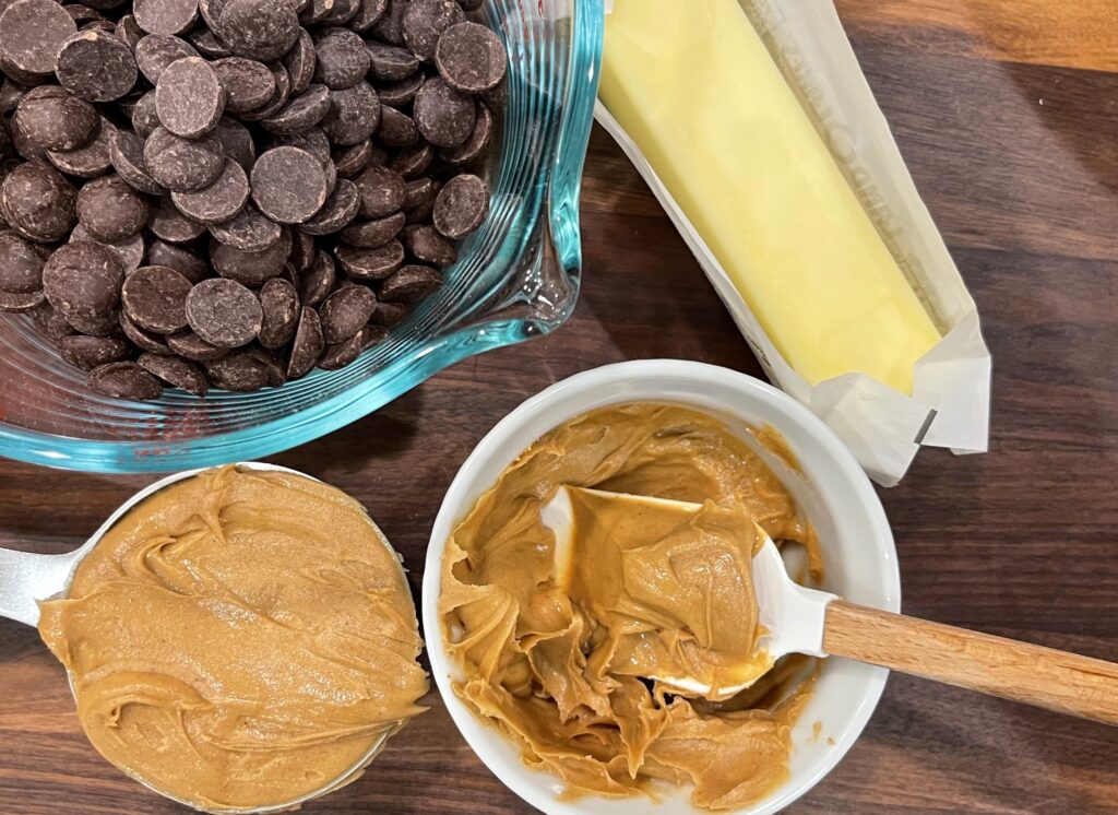 - Combine the chocolate chips, peanut butter, and the butter into a microwave safe bowl or measuring cup. Melt on medium setting, using 30 second intervals, stirring as you go.