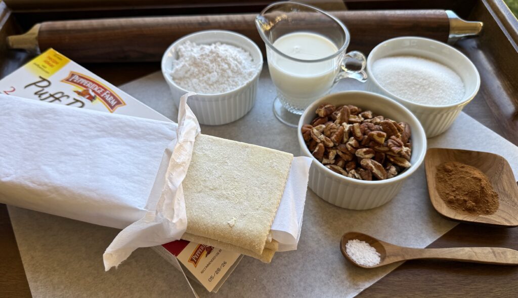 The list of ingredients is simple. Sugar, ground cinnamon, toasted pecans and kosher salt along with frozen puff pastry, milk and powdered sugar.