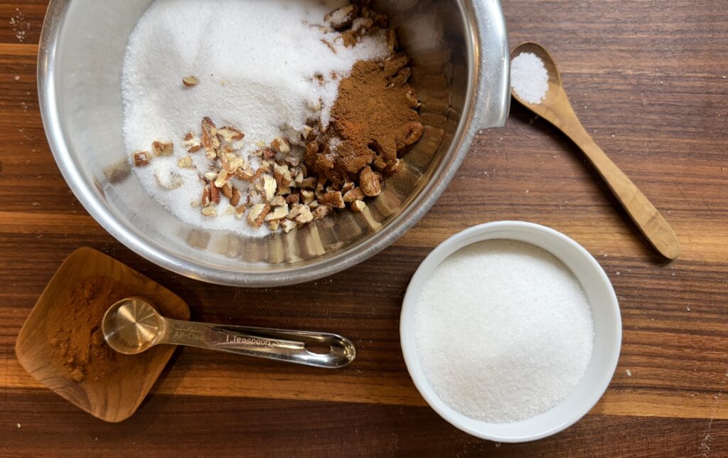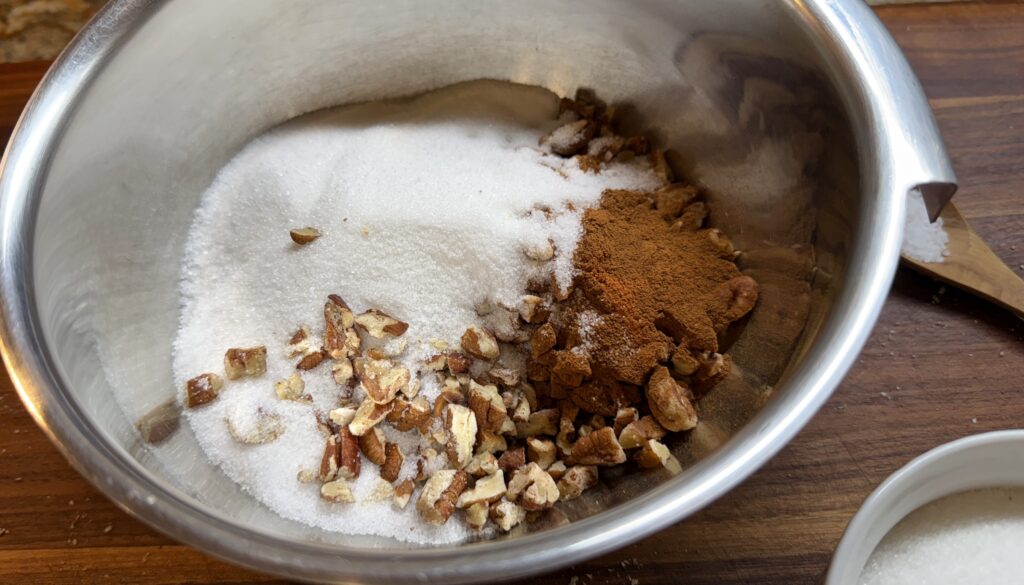 - Preheat the oven to 375-degrees. In a small bowl, whisk the sugar together with the cinnamon, kosher salt and pecans.