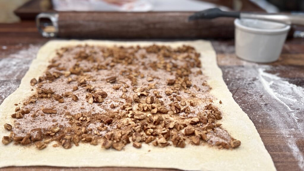 Roll out the sheets of puff pastry and brush with milk before scattering the sugar, cinnamon and pecans across them. Then roll, slice, and bake.