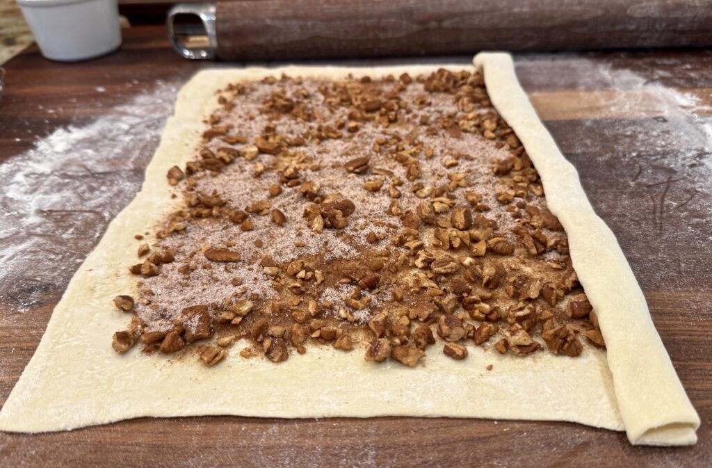 Brush the pastry from edge to edge with 1 tablespoon of the milk. Spread half of the sugar, cinnamon and pecan mixture over the pastry leaving ½” border. Starting with the longest side, roll the pastry up.