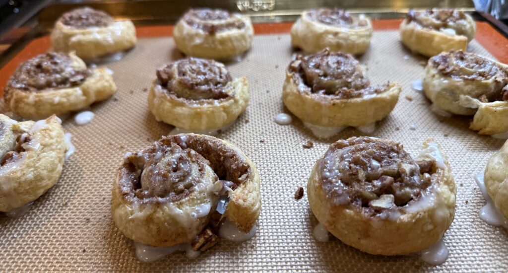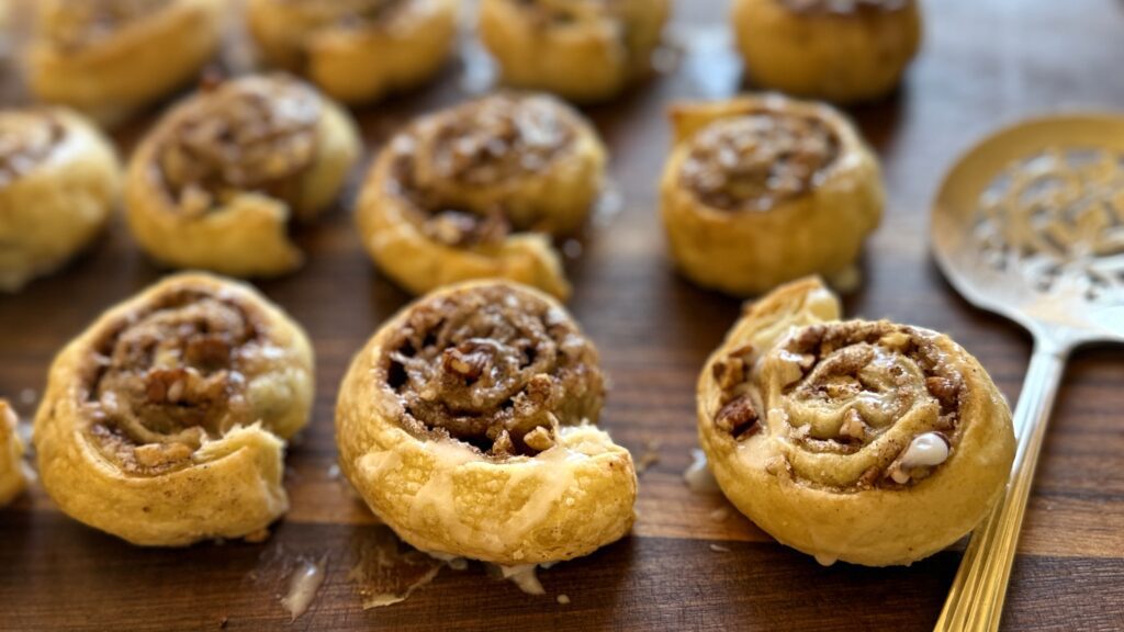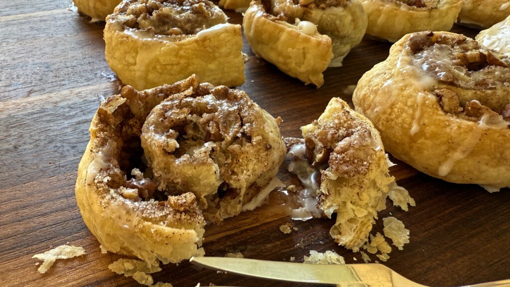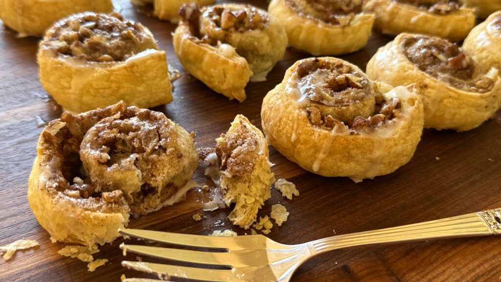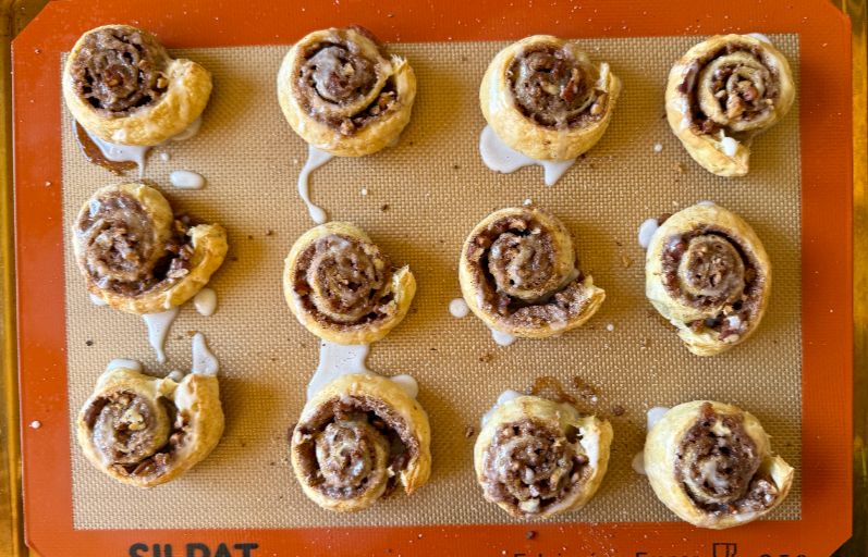 Tuck cinnamon, sugar and toasted pecans inside delicate strips of puff pastry and bake until light and crisp. Finish with a drizzle of royal icing and in no time, you’ve got a wonderful bite perfect with your morning coffee or afternoon tea.
