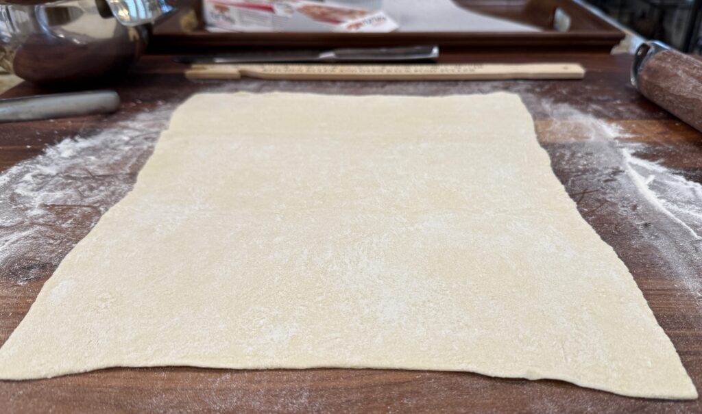 Carefully unfold one sheet of the puff pastry and place it on a lightly floured surface. Roll the pastry out into a rectangle about 12” x 14”.
