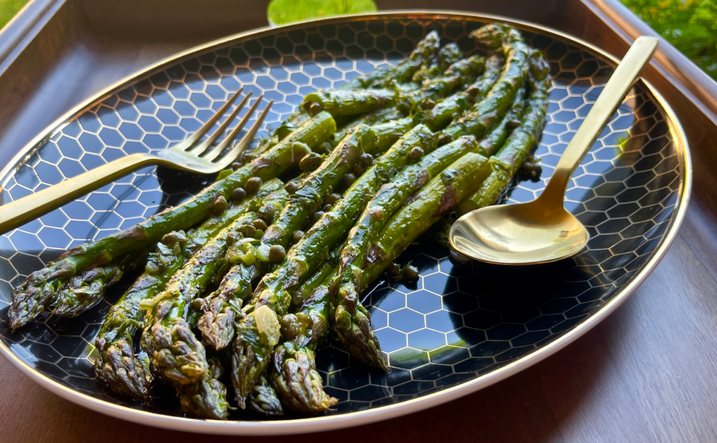 - Arrange the roasted asparagus on a platter. Drizzle the herb vinaigrette over the asparagus and sprinkle extra capers over the top. You will have extra vinaigrette.