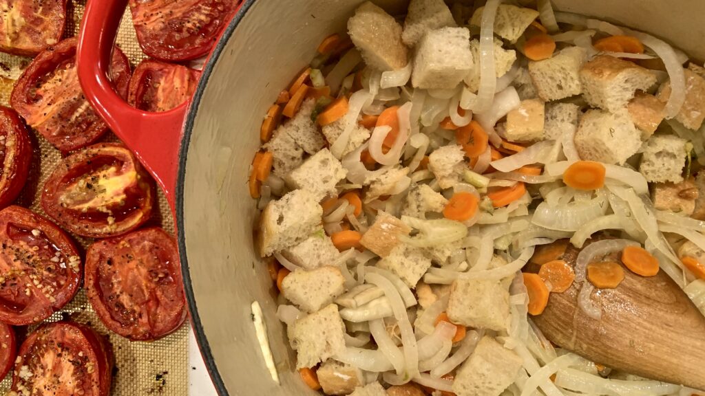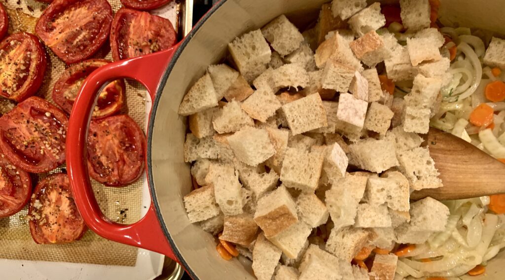 The complexity of flavors in the soup comes from carrots, fennel, sweet onion and of course those roasted tomatoes and garlic. The heartiness is compliments of ciabatta, a fabulous Italian bread that’s hidden within the soup.