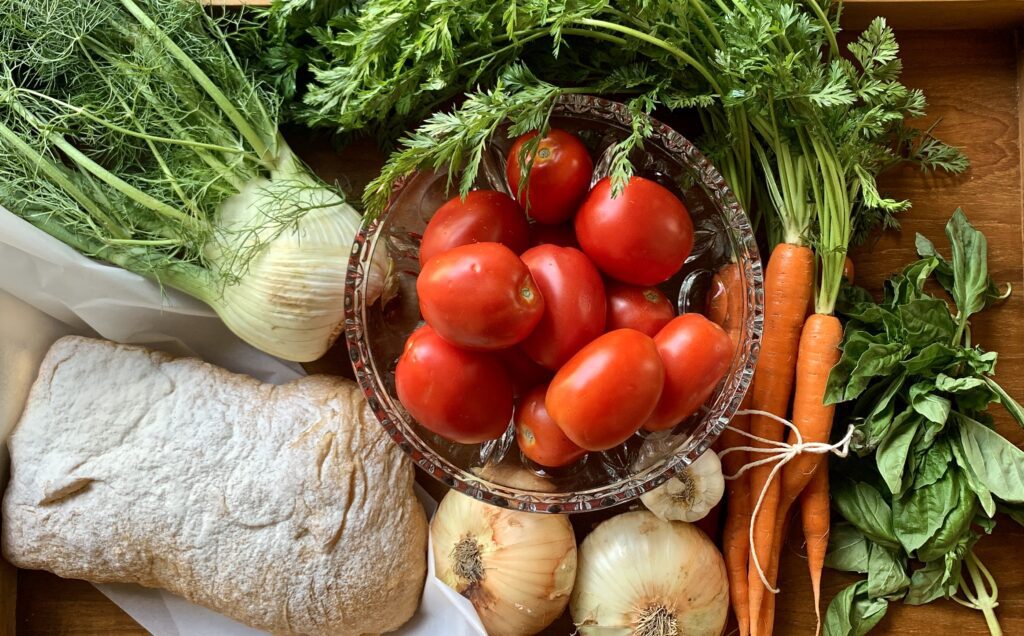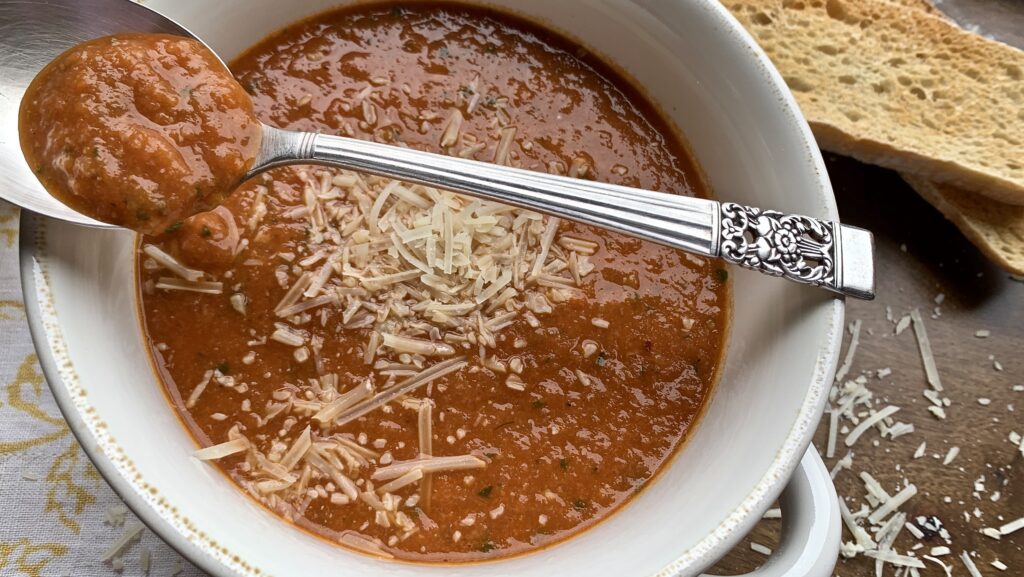 It’s a savory soup loaded with red, ripe tomatoes roasted with garlic and olive oil, along with sautéed fennel, sweet onions, carrots, and a mountain of fresh basil. Cubes of ciabatta bread are tossed in, adding body and soaking up the base of the soup made with a robust red wine and rich chicken stock. No matter the date on your calendar, any day is a good day for soup!