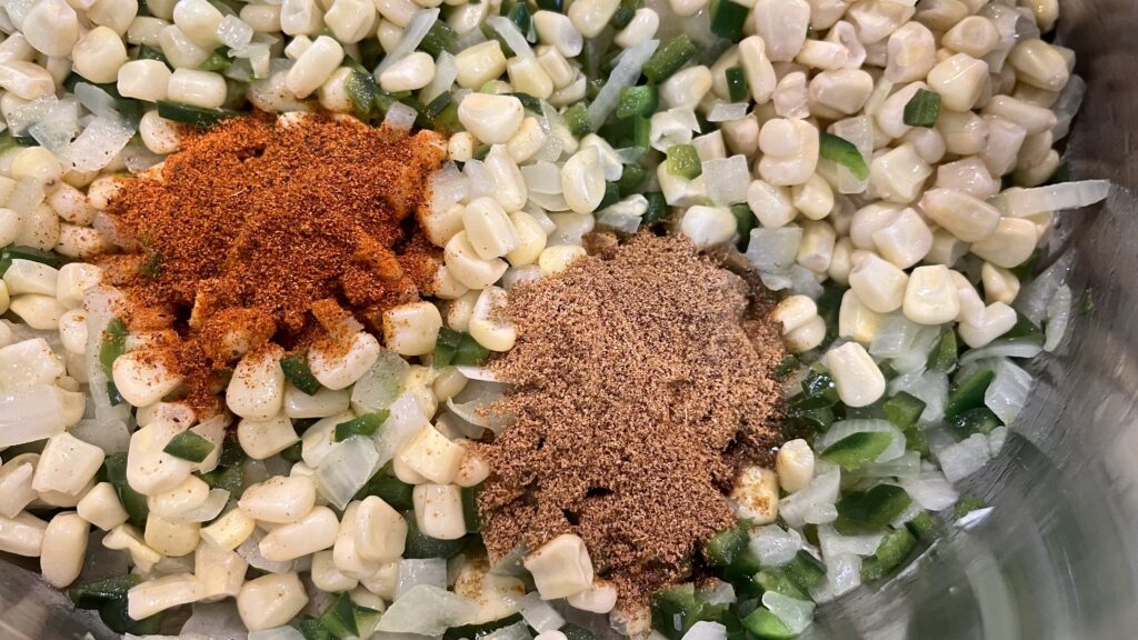 - Toss in the corn and stir together with the onion and peppers.