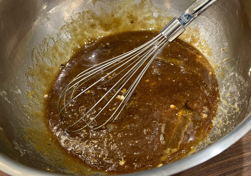 With a quick whisk it’s ready in about 5 minutes then it’s off to the oven!