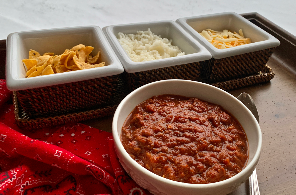 In Texas, there are a number of food groups that stir up strong passion and opinion among its residents. Chili is one of them. For decades, events have been centered around chili and it’s said that in the U.S. over 100 million cans of chili are consumed every year. Most everyone has a favorite recipe with their preferred type of meat used and whether to add beans or no beans. I have two favorite recipes. This version has roots stemming from a combination of vintage Texas recipes. It tops the list for my Engineer – and we’ve been told it has won more than one cook-off contest!