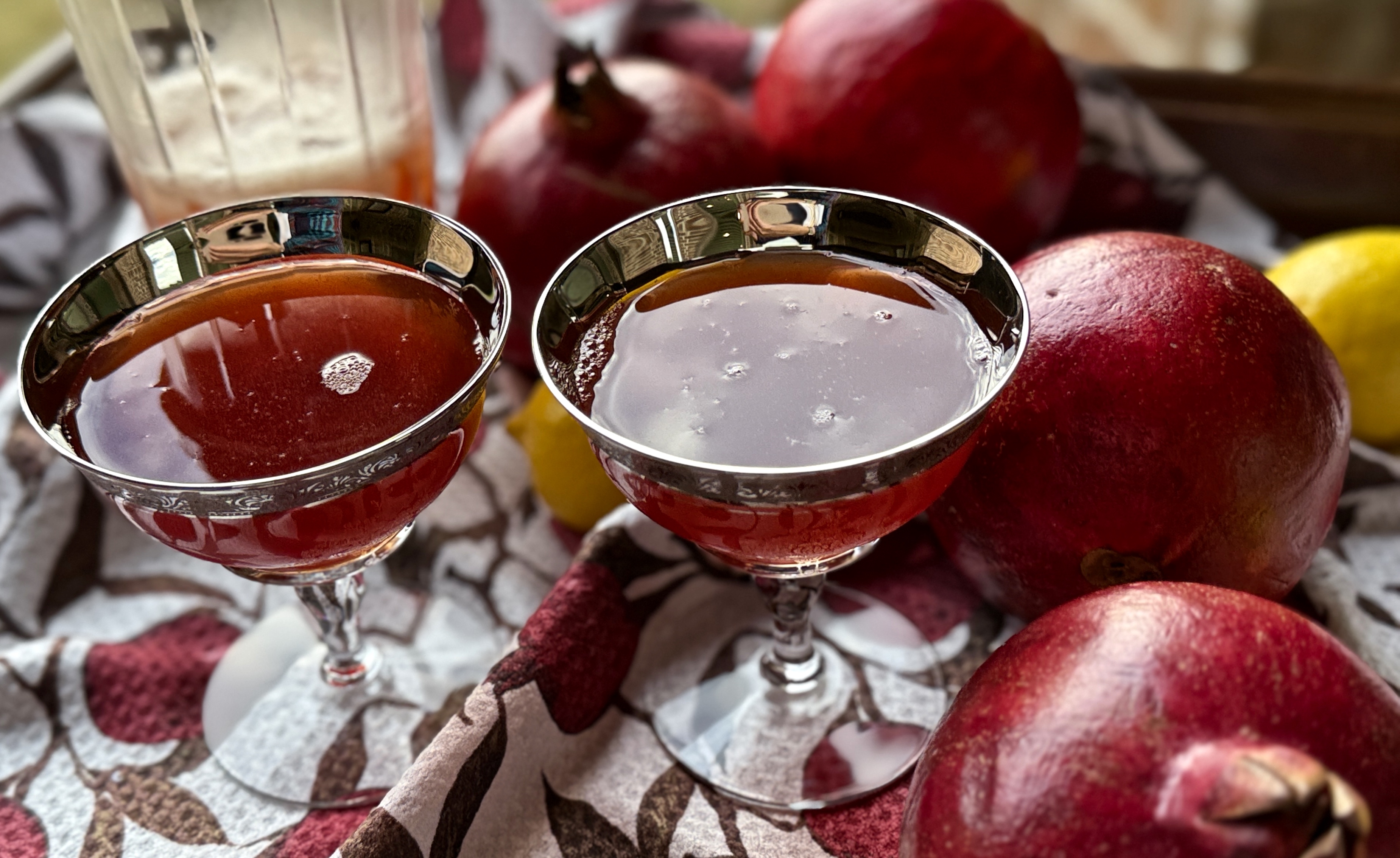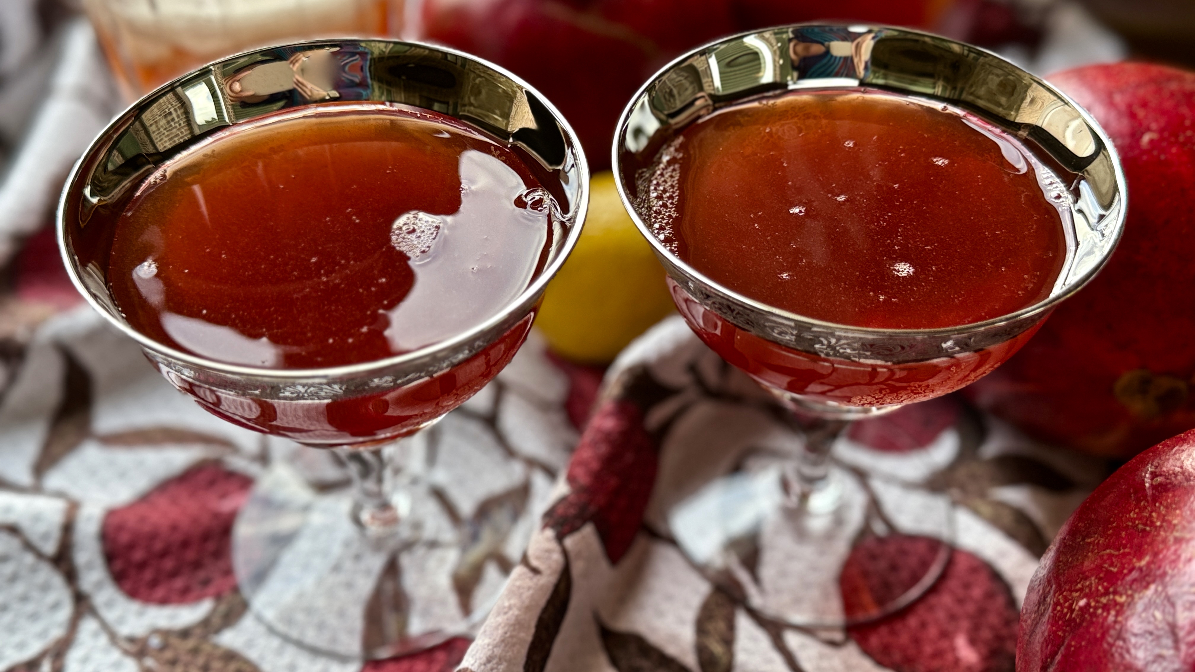 Slightly sour with a sweet hint of pomegranate dancing around with a great rye whiskey! Add a bit of sweet vermouth, a good squeeze of fresh lemon and a dash or two of orange bitters and you’ve got a delightful and gorgeous cocktail ready to toast the holiday!