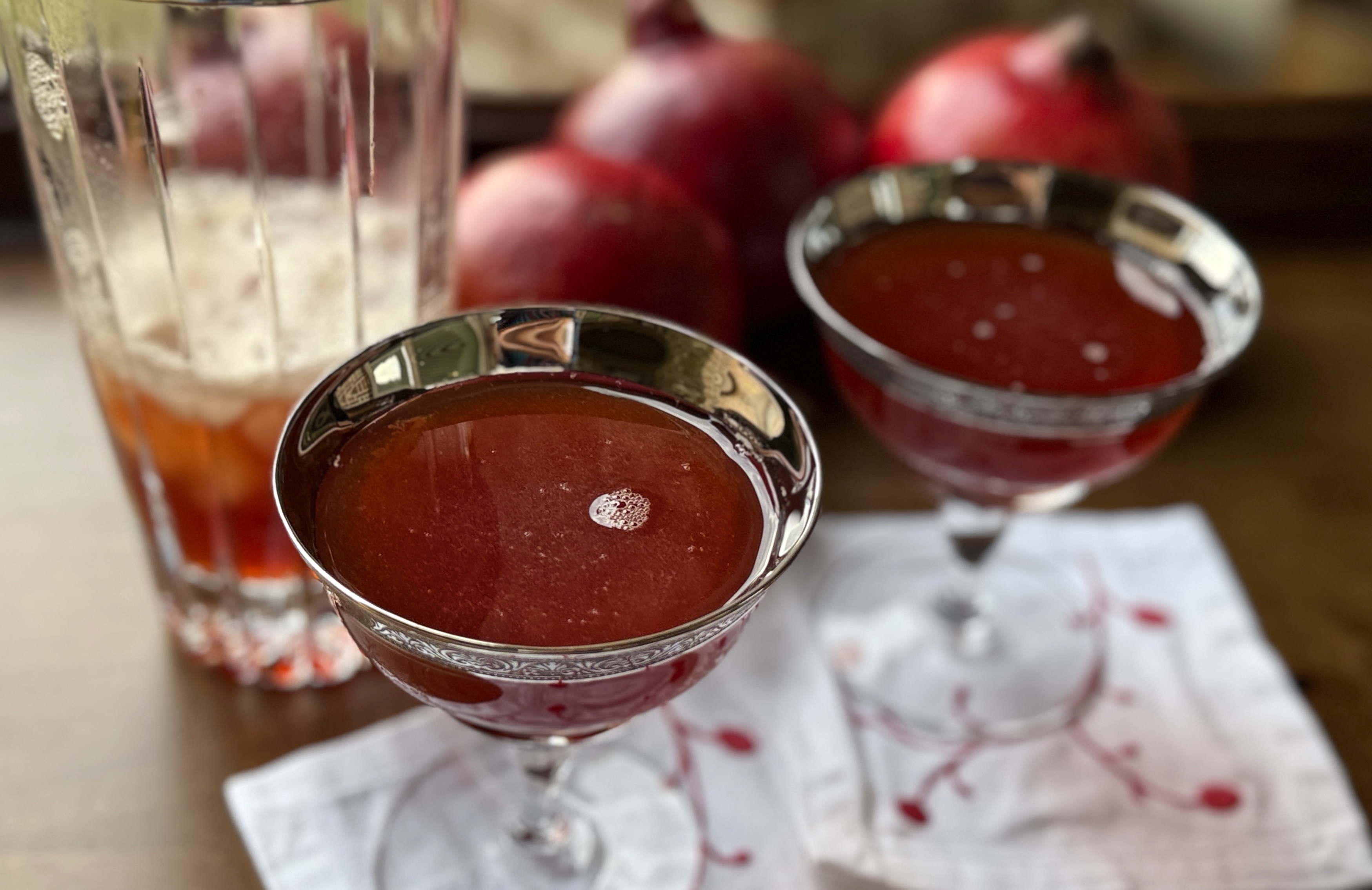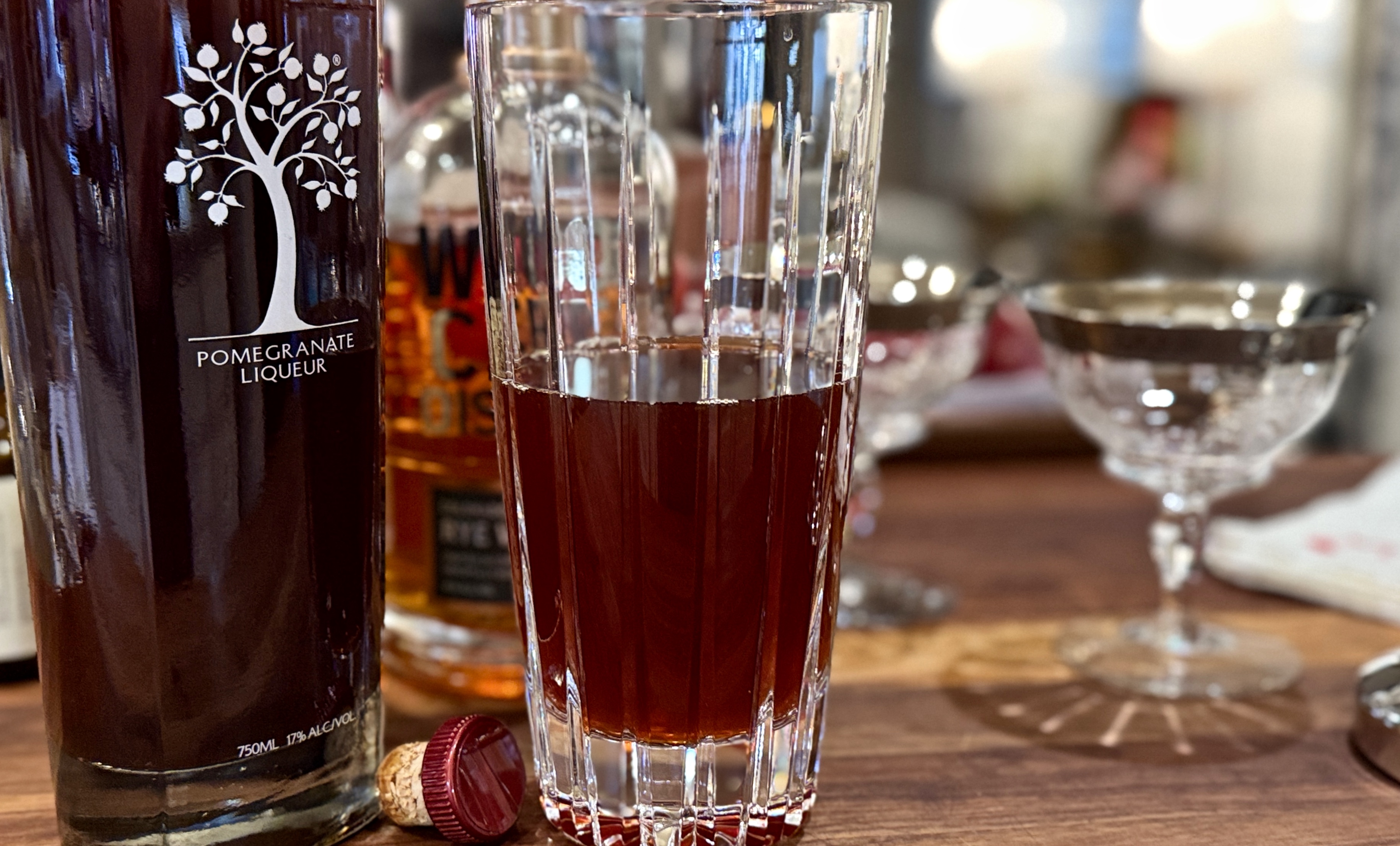 The original recipe calls for dry vermouth and there is no mention of pomegranate liqueur. I used sweet vermouth and loved the result – but you can use your favorite. And I happened to have pomegranate liqueur on hand and since it’s still the holidays, I thought why not! It gives a nice boost to the pomegranate flavors in found in grenadine.