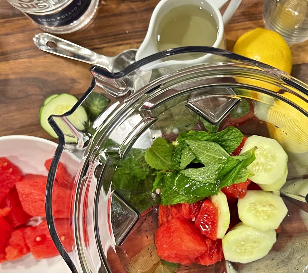 Toss the watermelon, cucumber, and mint leaves into the canister of a blender. Pour in the lemon juice, vodka, and simple syrup.