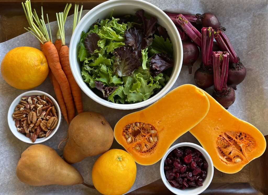 For the salad, butternut squash, beets, carrots share the platter of fresh field greens with navel oranges and tender Bosc pears. Scatter dried cranberries for a hidden treat plus toasted pecans for a delightful crunch.